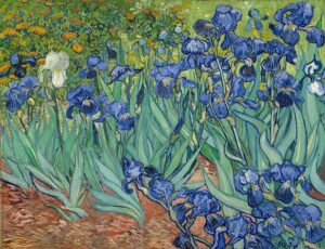 “A Íris” é uma pintura vibrante criada durante o tempo de Van Gogh no asilo de Saint-Rémy. As flores, com seus tons roxos contrastantes com o fundo verde, são retratadas com a técnica expressiva característica do artista. Embora a obra seja de uma natureza mais serena do que outras criações de Van Gogh, ainda carrega uma sensação de urgência nas pinceladas. A obra é frequentemente interpretada como uma representação de esperança e renovação, refletindo o desejo do artista por cura. Hoje, “A Íris” faz parte do acervo do J. Paul Getty Museum, em Los Angeles.