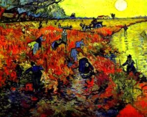 “A Vinha Encarnada” é uma das poucas pinturas que Van Gogh vendeu em vida. Ela retrata uma paisagem rural em Arles, com vinhedos iluminados pelo pôr do sol. A intensidade das cores — com tons vibrantes de vermelho, laranja e amarelo — reflete a habilidade de Van Gogh em transmitir emoções através da cor. A obra capta um momento de mudança, à medida que os trabalhadores colhem as uvas ao cair da tarde, simbolizando o ciclo da vida e o trabalho humano em harmonia com a natureza. O quadro atualmente está no Museu Pushkin, em Moscou.