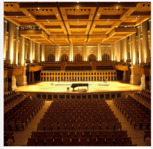 O palco, espaçoso e bem iluminado, oferece, portanto, condições ideais para performances de grandes orquestras e solistas.